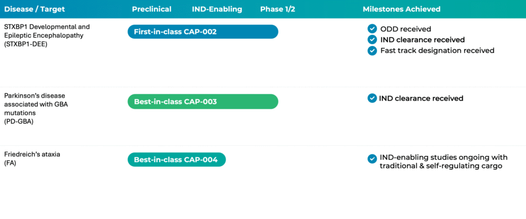 CAP-002 received FDA IND clearance. The FDA has granted Fast Track and Orphan Drug Designation to CAP-002 for the potential treatment of STXBP1-DEE. More information on the Phase 1/2a SYNRGY study is available at clinicaltrials.gov (NCT06983158).